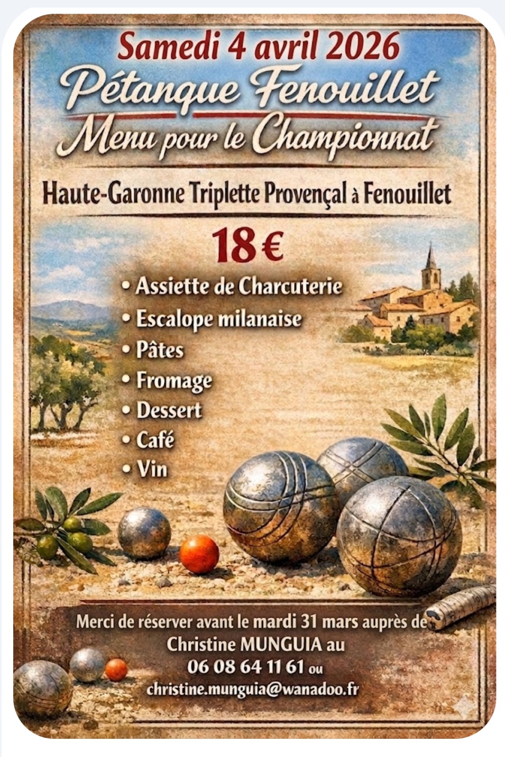Le weekend 4 et 5 Avril va se jouer le Championnat Haute-Garonne Triplette Jeu Provençal à FENOUILLET 8h Jet du but.